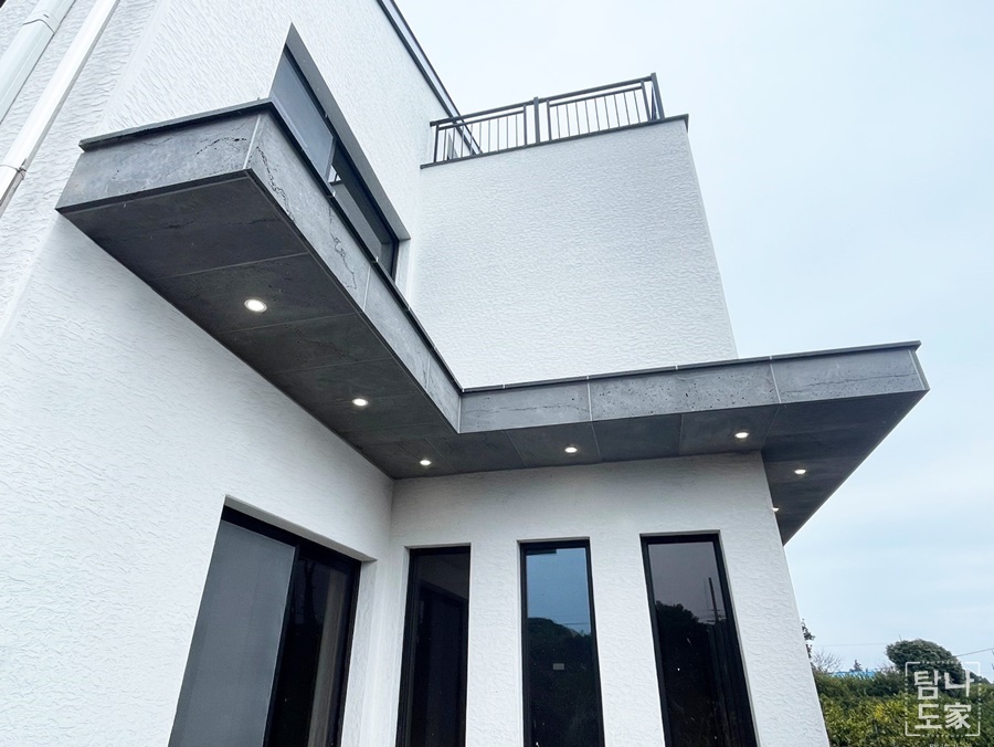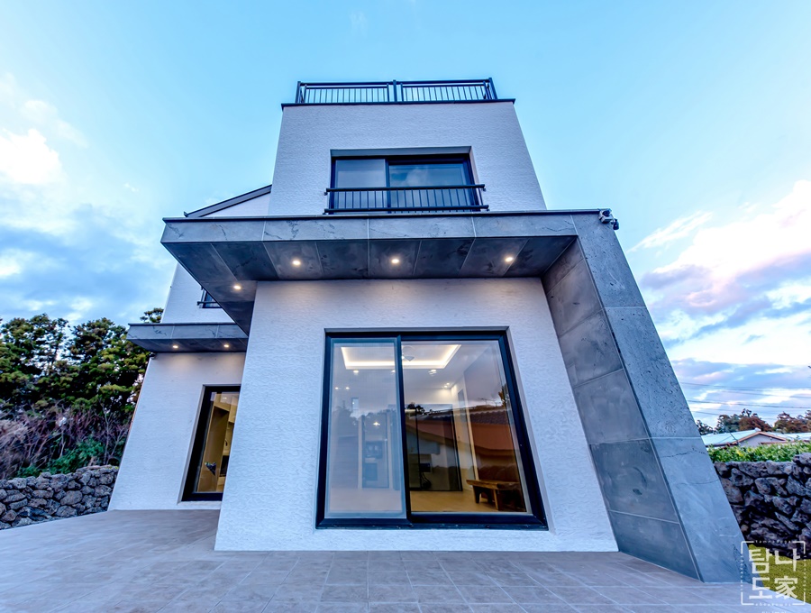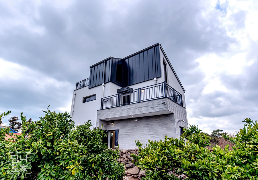 제주의 하늘과 어우러지는 깔끔한 화이트 외벽, 징크 포인트가 세련미를 더한 모던 하우스입니다.